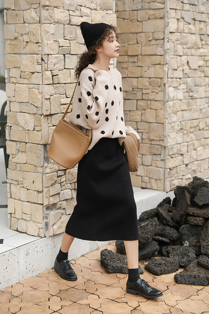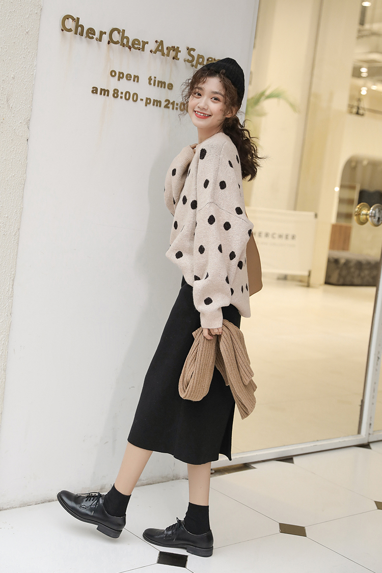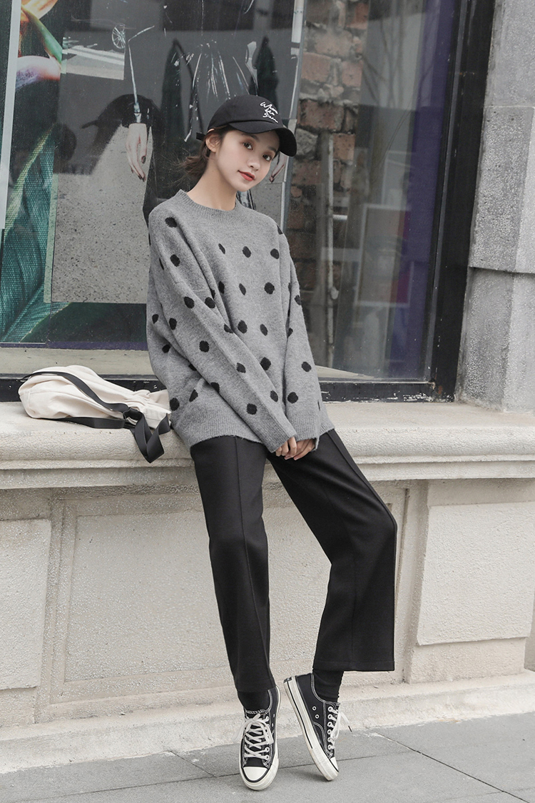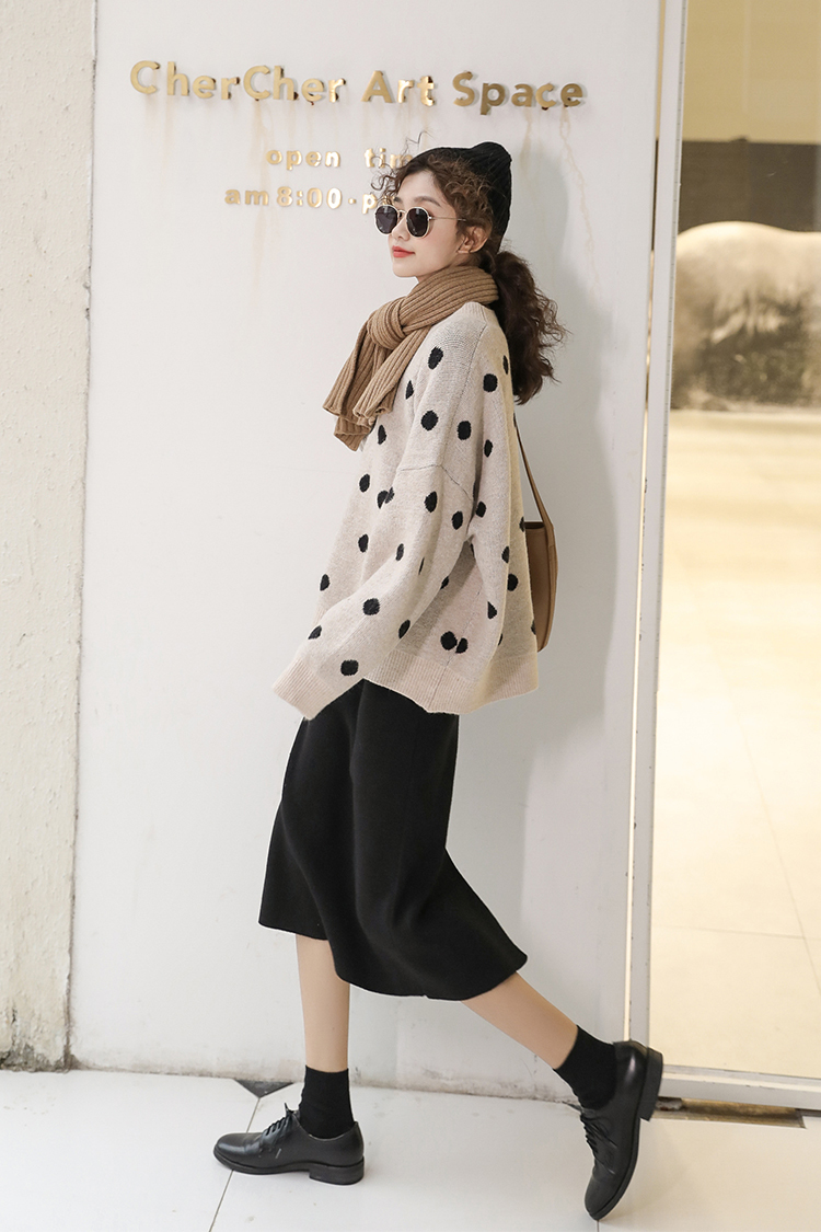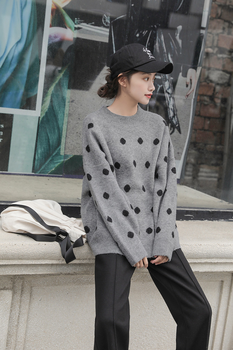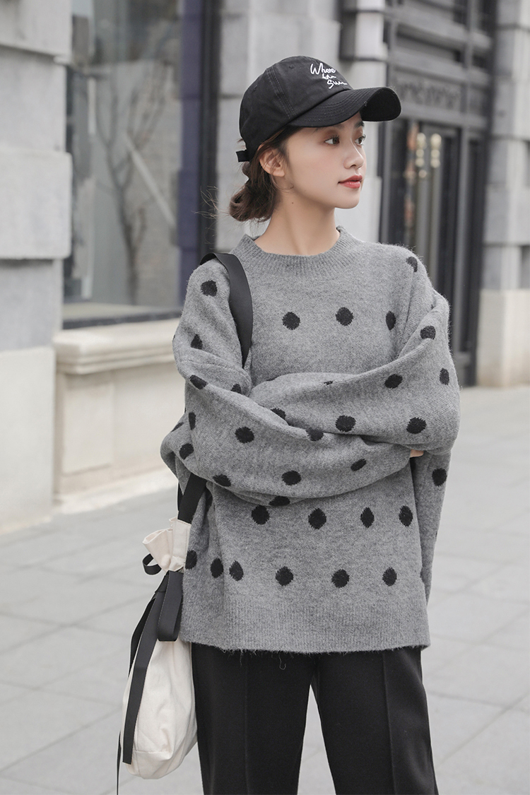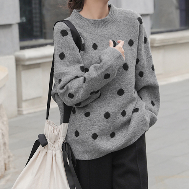 カジュアルながらもドットが女性らしく可愛い雰囲気のクルーネックニットです。