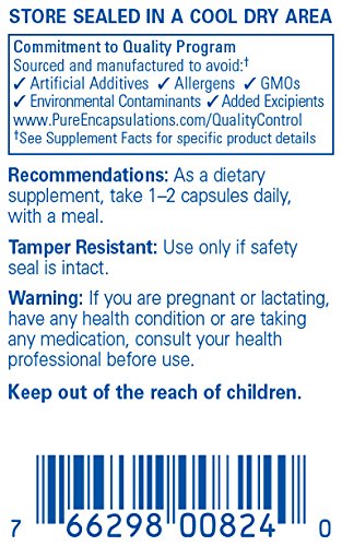 FREE FROM: Pure Encapsulations products are free from wheat, gluten, egg, peanuts, magnesium stearate, hydrogenated fat, artificial sweeteners and colors, and other unnecessary excipients. Any product containing ingredients derived from allergens, such as soy, dairy or shellfish is clearly labeled. * These statements have not been evaluated by the Food and Drug Administration. This product is not intended to diagnose, treat, cure, or prevent any disease.