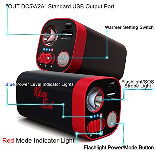 Kozy Xcel 10,400mAh Rechargeable Hand Warmer Provides Comfortable,Soothing Warmth for Hours from its Powerful Lithium Batteries, Includes Bonus Warmer Pouch, USB Charger/Power Bank, and LED Flashlight