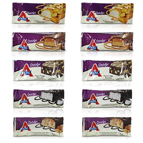 -. Feature : In This Variety pack you will receive 10 BARS which includes 2 of the following 5 flavors: Caramel Nut Chew, Nutty Fudge Brownie,Peanut Caramel Cluster, Chocolate Coconut and Chocolate Carmael Mousse. / Atkin Endulge Bar; Satisfy your sweet cravings with an indulgent treat, a perfect dessert without all the sugar / Only 2 grams of net carbs and 1 gram of sugar per serving per bar. / 120 calories / Great for a quick, convenient, guilt-free snack