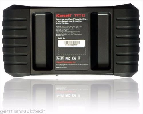 -. Feature : Sold and Distributed by GERMAN AUDIO TECH / Brand New! Authentic iCARSOFT device. Ready to use Out-of-the-box! / TYT II is a professional and powerful vehicle fault diagnosis tool developed by iCarsoft Technology Inc. With a 4" TFT LCD and unique diagnostic software,it features full ECU diagnosis of single vehicle brand and test modes mainly include: CANBUS, ISO9141, KWP2000, J1850 etc. It enable technicians to accurately diagnose complex problems. / Feature: • TYT II can do it all-reads and clears trouble codes on all the systems such as engine, transmission, ABS and airbag etc. • Read Data Stream • Full ECU Diagnosis • Applies to the entire models of TYT equipped with OBDII-16 DLC • Easy To Use With Metal Dome Keys • Oil Light/Service Reset:Support service lamp reset, Brake pad reset function, Steering angle sensor calibration etc. / EPB:Opens and closes the brake pads,Reads and clears EPB/SBC trouble codes, • Turns off the ECU and brake warning light,Diagnoses EPB/SBC caliper functionality, Resets the brake pad thickness service etc. • ABS/AIRBAG:Diagnoses ABS/ SRS system codes, Reads/clears codes of ABS/SRS system and turns off ABS/SRS warning light, Performs bi-directional tests such as cycling the ABS solenoids, Retrieves ABS/SRS ECU information etc.