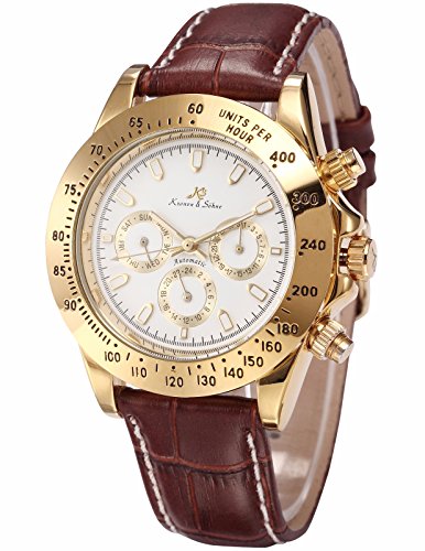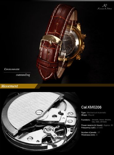 -. Binding : Watch -. Brand : KS -. Department : Mens -. EAN : 0700900780117 -. Feature : Original KS watch. Genuine Kronen & Söhne Watch / Present by Kronen&Söhne group, Imperial series / Precision Movement with the latest breakthrough Kronen&Söhne Patented Mechanical Technology / ATTENTION!!! Automatic movements mark the passage of time by a series of gear mechanisms, and are worked by the movement of your wrist as you wear it. It will stop if the watch stop moving for a long time, please turn the crown of watches by hand / Be Sent in a solid box with a warranty card. 12 months International Guarantee -. Label : KS -. Manufacturer : KS -. MPN : KS162 -. PackageQuantity : 1 -. PartNumber : KS162 -. ProductGroup : Watch -. ProductTypeName : WATCH -. Publisher : KS -. Studio : KS -. Title : KS Imperial Day Date Gold Case Brown Leather Men Automatic Mechanical Wrist Watch KS162 -. UPC : 700900780117