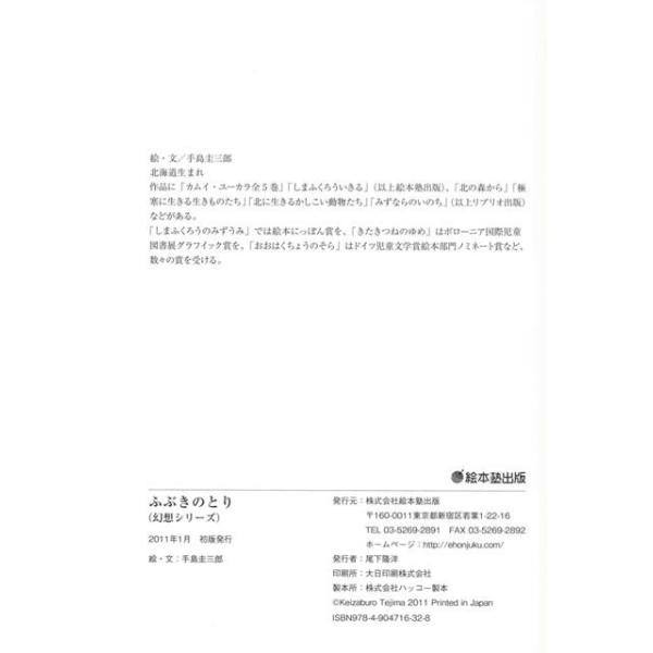 【商品基本情報】 商品名称:ふぶきのとり 著者/出版社:手島 圭三郎/手島 圭三郎 初版発行日:2011/01/01 サイズ:B5判 ページ数:40 ISBN/JAN:9784904716328/4528189449794