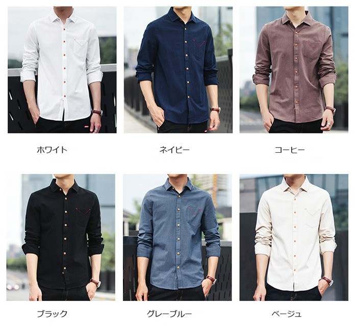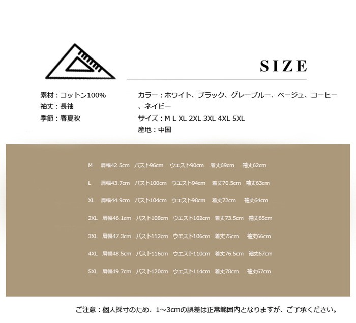 シャツ メンズ カジュアルシャツ メンズ 長袖 無地トップス コットン100% 大きいサイズ 柔らかい アメカジ M~5XL 2018春新作 リネンシャツ メンズ 無地 トップス 大きいサイズ カジュアル商品詳細素材:コットン100%袖丈:長袖季節:春夏秋カラー:ホワイト、ブラック、グレーブルー、ベージュ、コーヒー、ネイビーサイズ:M L XL 2XL 3XL 4XL 5XL産地:中国サイズ参照表M 肩幅42.5cm バスト96cm ウエスト90cm 着丈69cm 袖丈62cmL 肩幅43.7cm バスト100cm ウエスト94cm 着丈70.5cm 袖丈63cmXL 肩幅44.9cm バスト104cm ウエスト98cm 着丈72cm 袖丈64cm2XL 肩幅46.1cm バスト108cm ウエスト102cm 着丈73.5cm 袖丈65cm 3XL 肩幅47.3cm バスト112cm ウエスト106cm 着丈75cm 袖丈66cm4XL 肩幅48.5cm バスト116cm ウエスト110cm 着丈76.5cm 袖丈67cm5XL 肩幅49.7cm バスト120cm ウエスト114cm 着丈78cm 袖丈67cmご注意:個人採寸のため、1~3cmの誤差は正常範囲内となりますが、御了承ください。シャツ メンズ カジュアルシャツ メンズ 長袖 無地トップス コットン100% 大きいサイズ 柔らかい アメカジ M~5XL 2018春新作 リネンシャツ メンズ 無地 トップス 大きいサイズ カジュアル