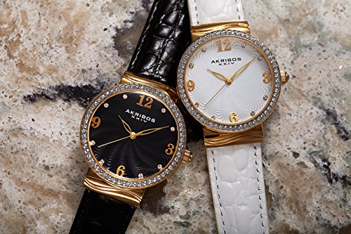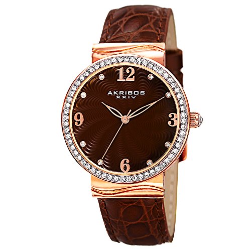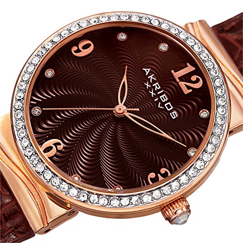 Akribos XXIV Glimmer Womens Casual Watch - Engraved Swirled Guilloche Dial - Quartz Movement - Crystal Filled Bezel - Leather Strap