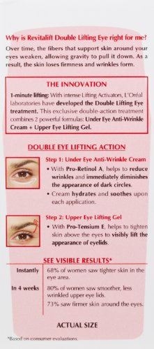 Experience advanced action against the signs of aging. RevitaLift Double Eye Lift is L'Oreal's first double-action eye treatment that combines two exclusive, complementary formulas, fortified Pro-Retinol A to minimize under-eye wrinkles and puffiness, and Pro-Tensium E to instantly firm and lift the upper eye area.Feature