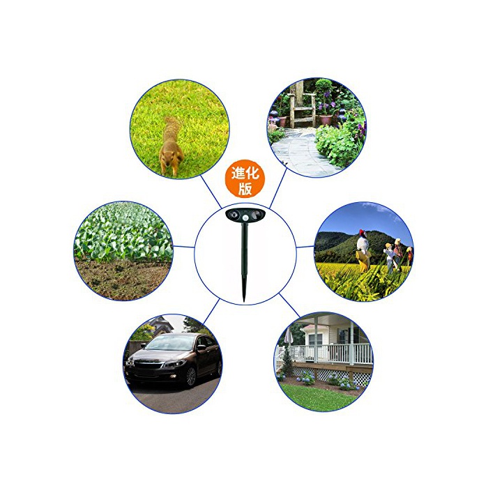 초음파와 LED라이트:자동 조정파 빈도에 야생 동물,고양이,개,쥐,키츠네,새,설치류 등이라고 야행성 동물을 상처 붙이지 않고 쫓아버립니다.
