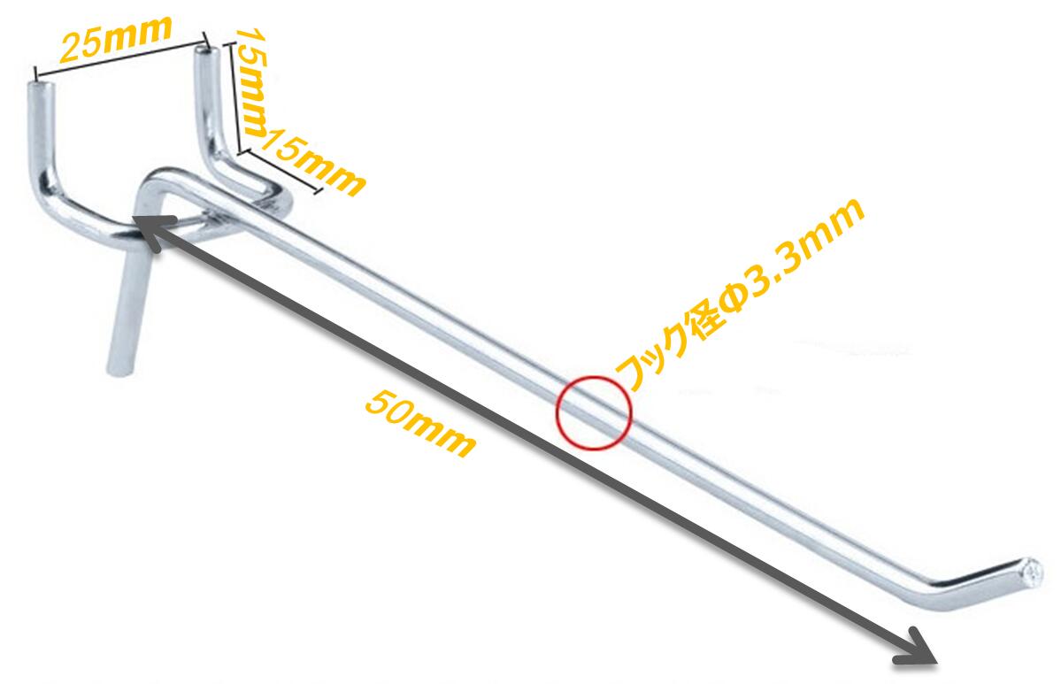 ・適合有孔ボード:穴径5mm、穴ピッチ25mm、厚さ1~2mm、フック直径3.3mm