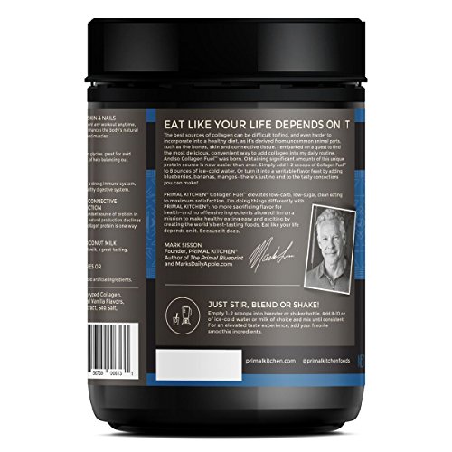 PALEO & WHEY FREE: Primal Kitchen Collagen Fuel is the perfect supplement to help support connective tissue, skin, hair and nails, adding 18,500 - 19,500 milligrams of collagen per serving.