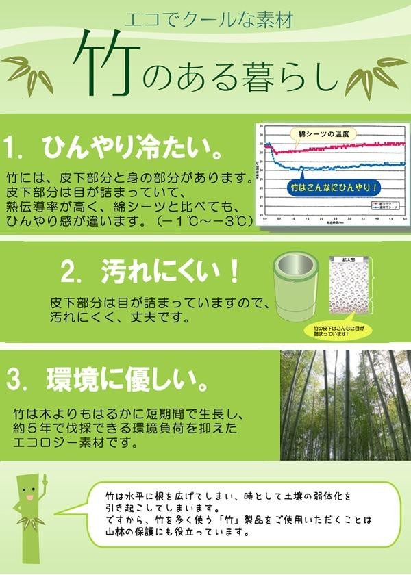 孟宗竹の表面付近の目がぎっしり詰まった部分のみを使用した竹ラグです。表面部分は特に汚れにくく耐久性に優れ、熱伝導率が高いため、ひんやり感も抜群です。 |