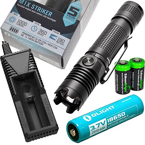 Olight M1X Striker Cree XM-L2 1000 Lumen LED Tactical Flashlight, Olight 18650 Li-ion rechargeable battery, charger with two EdisonBright CR123A Lithium Batteries