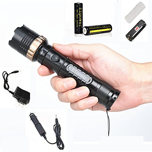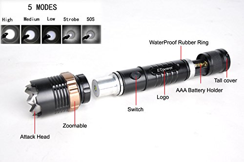 ETpower 800LM Portable Waterproof T6 Tactical Zoomable flashlight(Self-Defense Function) LED Light with Rotating head include 18650 Rechargeable battery with Car Charger and Wall Charger(Black)