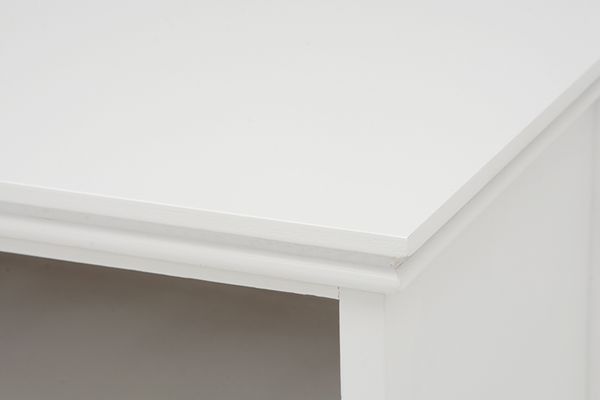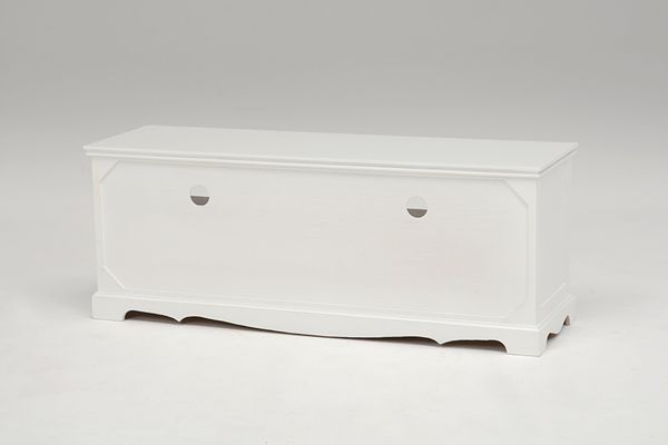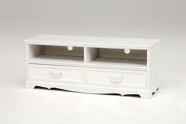 ●上品な白い取っ手が付いたテレビ台。DVDなどの収納に使える引出付き。幅110㎝