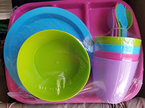 -. Feature : - 24 piece kids place setting (4 Sets in Pink, Green, Blue, Purple) / - Makes mealtime fun for kids: 4 compartment divided trays - 9.1" x 11.8"- Each has 1 large and 3 regular sections / - 4 bowls - 12.2 oz, 4 plates with 7.5" diameter and 4 cups 9.1oz. Matching utensils - 4 spoons and 4 forks / BPA Free Polypropylene Hand wash only