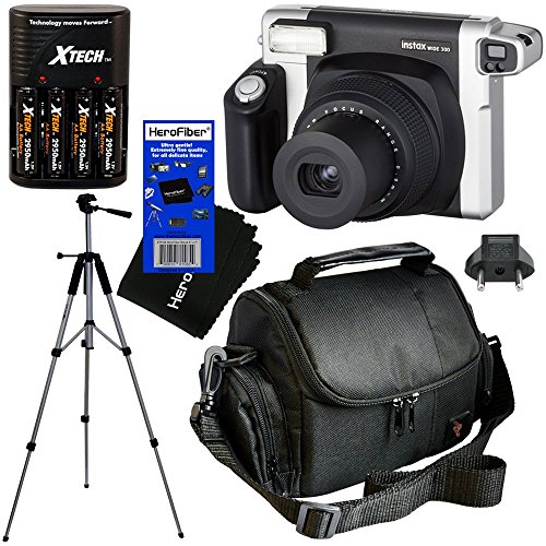 Fujifilm INSTAX 300 Wide-Format Instant Photo Film Camera (Black/Silver) + 4 AA High Capacity Rechargeable Batteries with Battery Charger + Full Sized 57" Tripod with Carrying Case + Well Padded Camera Case + HeroFiber Ultra Gentle Cleaning Cloth