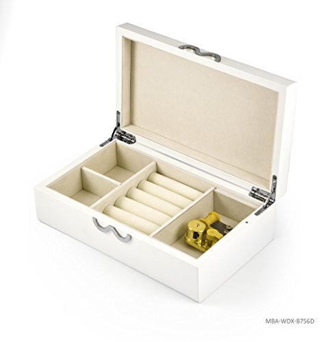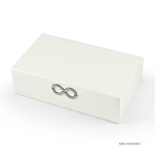 -. Feature : Tune: 18 note movement (please choose above option for available song titles) / Contemporary Matte White Infinity Musical Jewelry Box / Exterior: Painted matte white finish, silver finished Infinity Symbol / Interior: Fabric lined backing, 2 open compartments / generous center ring rolls / Wood/Materials: wood, painted finish, all lined in plush beige fabric