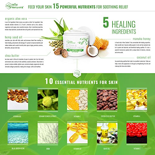 Studio : Wild Naturals Publisher : Wild Naturals Binding : Health and Beauty Product Description Get Natural Relief From Dry, Itchy, Cracked, or Irritated Skin With Our Powerful 15-in-1 Formula Our eczema and psoriasis cream is packed with organic, food-grade nutrients providing instant relief, while boosting healing, with every essential vitamin, mineral, and amino acid your skin needs to be healthy. Why Our Cream Is Better - Stops itching fast