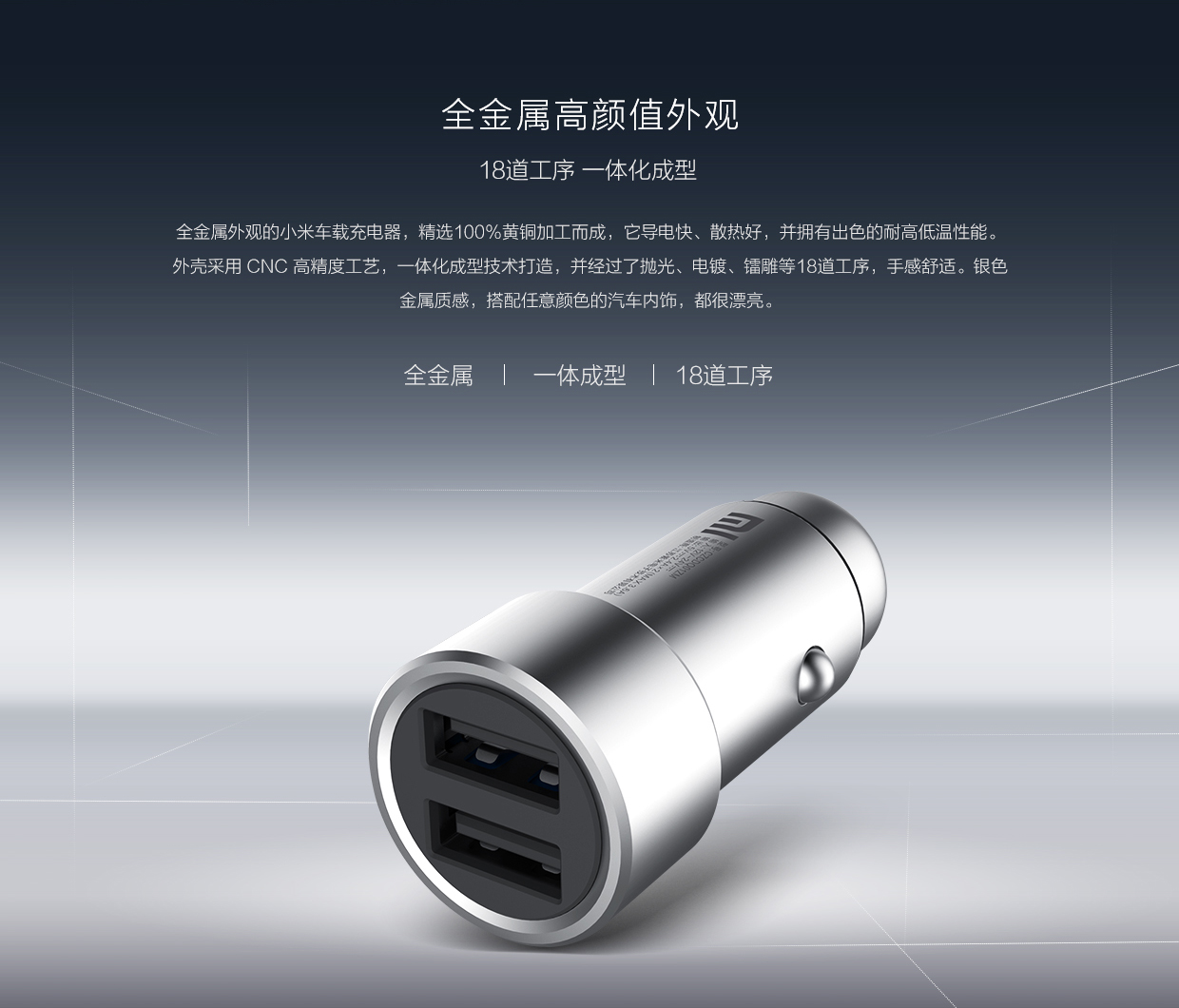 Xiaomi Mi Car Charger ini menggunakan material alluminium alloy yang membuatnya terlihat premium dan elegan saat Anda pasang di dashboard mobil Anda.