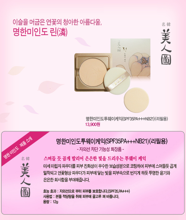 | | |  | | 탈크·마이카(CI77019)·티타늄디옥사이드(CI77891)·실리카·나일론-12·에칠헥실메톡시신나메이트·보론나이트라이드·징크옥사이드(CI77947)·메칠메타크릴레이트크로스폴리머·트리메칠올프로판트리에칠헥사노에이트·트리에칠헥사노인·마그네슘미리스테이트·디·치콘·마그네슘스테아레이트·메치콘·쟈스민오일·연꽃추출물·구기자추출물·당귀추출물·복령추출물·새삼씨추출물·작은쇠·릎뿌리추출물·장뇌삼추출물·하수오추출물·국화꽃추출물·금은화추출물·단수수씨/껍질/줄기추출물·붉은누룩곰팡이추출물·서양벌노랑이꽃추출물·접시꽃추출물·치자추출물·홍화추출물·부틸렌글라이콜·칼슘카보네이트·하이드로제네이티드레시틴·합·비즈왁스·정제수·트리에톡시카프릴릴실란·카프릴릭/카프릭트리글리세라이드·덱스트린·메칠파라벤·부틸파라벤·향료·황색·화철(CI77492)·적색산화철(CI77491)·흑색산화철(CI77499)·울트라마린(CI77007)·비스머스옥시클로라이드(CI77163) | | | | | |