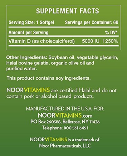 NoorVitaminsTM Vitamin D3 5000 IU Supplement: Vitamin D is so important in maintaining our health and it's equally important to get the right dosage. With NoorVitamin's Vitamin D3 5000 Supplement, you know that you're getting a high quality premium dose of your daily Vitamin D ** What You Get With Noor Vitamin D3 5000 ** - Small soft gel packed full of Vitamin D - Assists in maintaining a healthy immune system - No artificial colors, flavors, or preservatives; No yeast, starch or gluten. - Ensuring healthy levels of Vitamin D in your body may promote your heart health - Specially formulated to be compatible with many dosage requirements - Helps maintain strong bones and teeth by enhancing the absorption of Calcium and Phosphorus - Can be taken daily or added up to an equivalent weekly dose recommended by a physician to treat any scope of deficiency - Perfect for adults who have been identified as Vitamin D deficient and have been recommended a higher dosage supplement by their physician - **Halal Certified Vitamin** *These statements have not been approved by the Food and Drug Administration. These products are not intended to diagnose, treat, cure or prevent any disease* NoorVitamins take pride in ensuring premium quality ingredients in all their Vitamins and Supplements. NoorVitamin's comes with a 100% Money Back Guarantee... Add to Cart and get your Vitamin D3 5000 today! 0 |