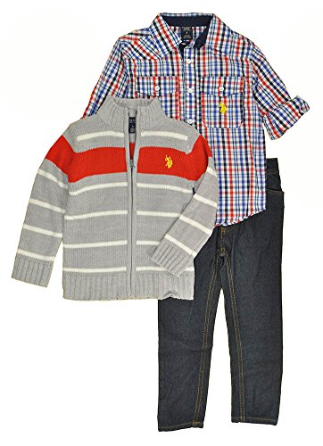 -. Binding : Apparel -. Brand : U.S. Polo Assn. -. Color : Gray -. Department : boys -. Feature : Sweater: 70% Cotton, 30% Polyester / Shirt: 100% Cotton / Pant: 100% Cotton / Made In Bangladesh / Machine Wash Cold -. Model : P5OF00M1-111215-PP.75 -. ProductGroup : Apparel -. ProductTypeName : PANTS -. Title : US Polo Assn Little Boys Gray & Red Zip Up Sweater 3pc Denim Pant Set