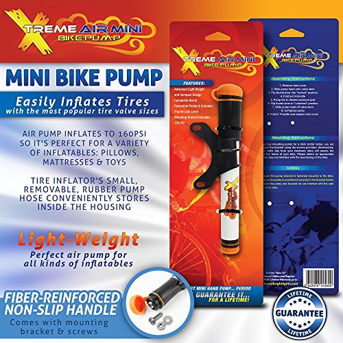 This light-weight, durable mini bike pump is designed to combine convenience and ease of use, with the ability to pump inflatables to 160psi. See images above. It mounts nicely to your bike frame below your water bottle. The rubber air hose tucks away neatly inside the housing of the pump when not in use. It's designed to accommodate most popular bike tire valves, and works great for all kinds of inflatables like air pillows, air mattresses, children's inflatable pools and other toys. It comes with our 100% Lifetime Guarantee so order yours today with confidence.