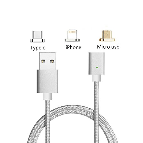 USB C Cable Magnetic,Animoeco Lightning+USB C+Micro 3 in 1 Multiple 2.4A Quick Charger Cable USB Nylon Braided For iPhone 7 7 plus/ 6 6s Plus/iPad Samsung Galaxy S6 S7 S8 plus Lg V20 (silver)