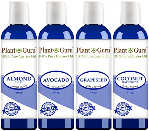 Indulge with this 4 pack of of our top selling 100% pure carrier oils. Plant Guru oils have absolutely nothing added and are the highest grade available. Our oils are laboratory tested for contaminants and biologicals and are certified to have no detectable levels of any harmful elements. Fractionated Coconut Oil: Our Fractionated Coconut Oil has been refined through a chemical free steam process to make it clear, stable, and odor free. This oil absorbs rapidly into the skin, making it the ultimate luxurious massage oil. Our Fractionated Coconut Oil contains absolutely no additional or hidden ingredients whatsoever. It is 100% pure Fractionated Coconut Oil and nothing else. Grapeseed Oil: Grape seed Oil is known to have number of benefits. This is fine textured oil which has almost no odor of its own and blends well with other oils. This oil is very good for skin toning and moisturizing. Sweet Almond Oil: Our Sweet Almond Oil is easily absorbed into your skin giving it needed moisture, yet does not clog pores. Sweet Almond Oil is very popular because of it's high concentration of oleic and linoleic fatty acids. Try it as a massage oil and you will love the silky feel! This Sweet Almond Oil has been refined through a chemical free cold press process to make it more transparent, stable, and odor free.