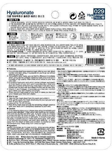 -. Binding : Misc. -. Brand : Dermal Korea -. EAN : 8809192705470 -. Feature : 1. You feel the difference immediately by using dermal essence mask. / 2. After using, it is possible for you to go out without washing face. / 3. With its Hyaluronate extracts and various mineral ingredients, it makes your skin relax, clear and moistened. / 4. It includes Vitamin E and Collagen which keeps your tired skin always healthy and elastic -. Label : Dermal Korea -. Manufacturer : Dermal Korea -. Model : 029 Hyaluronate -. MPN : 029 Hyaluronate -. PackageQuantity : 100 -. PartNumber : 029 Hyaluronate -. ProductGroup : Beauty -. ProductTypeName : BEAUTY -. Publisher : Dermal Korea -. Studio : Dermal Korea -. Title : Dermal Korea Collagen Essence Full Face Facial Mask Sheet - Hyaluronate (10 Pack)