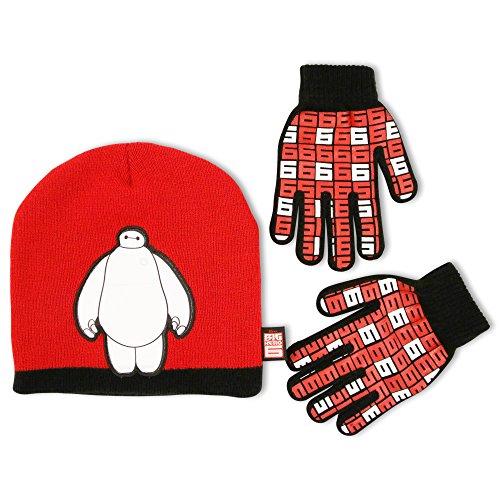 - Red and black winter beanie hat and gloves are 100% acrylic, exclusive of decoration. Hat features sublimated microfiber applique of Baymax with embroidered edge and contrasting trim. Matching magic gloves feature the number 6 in a toss gripper pattern