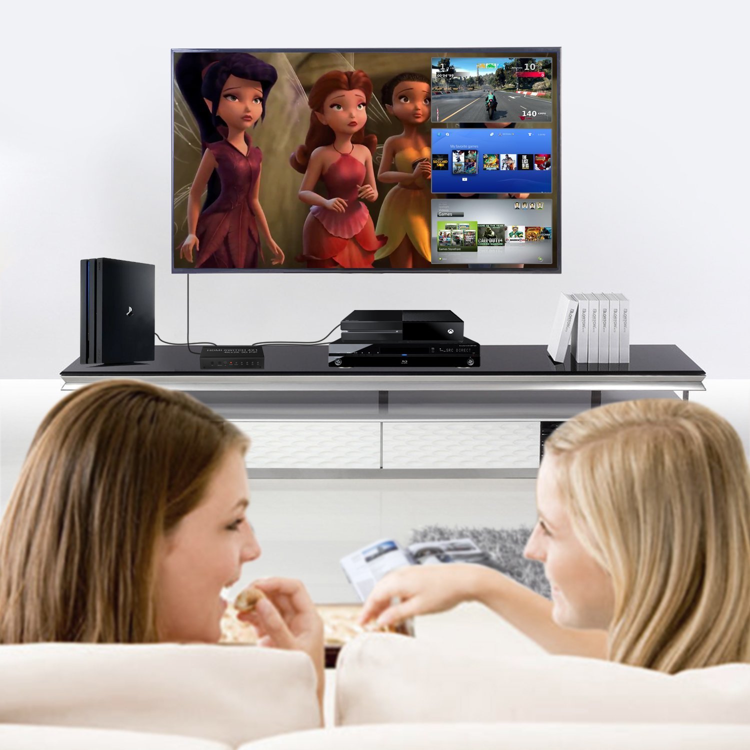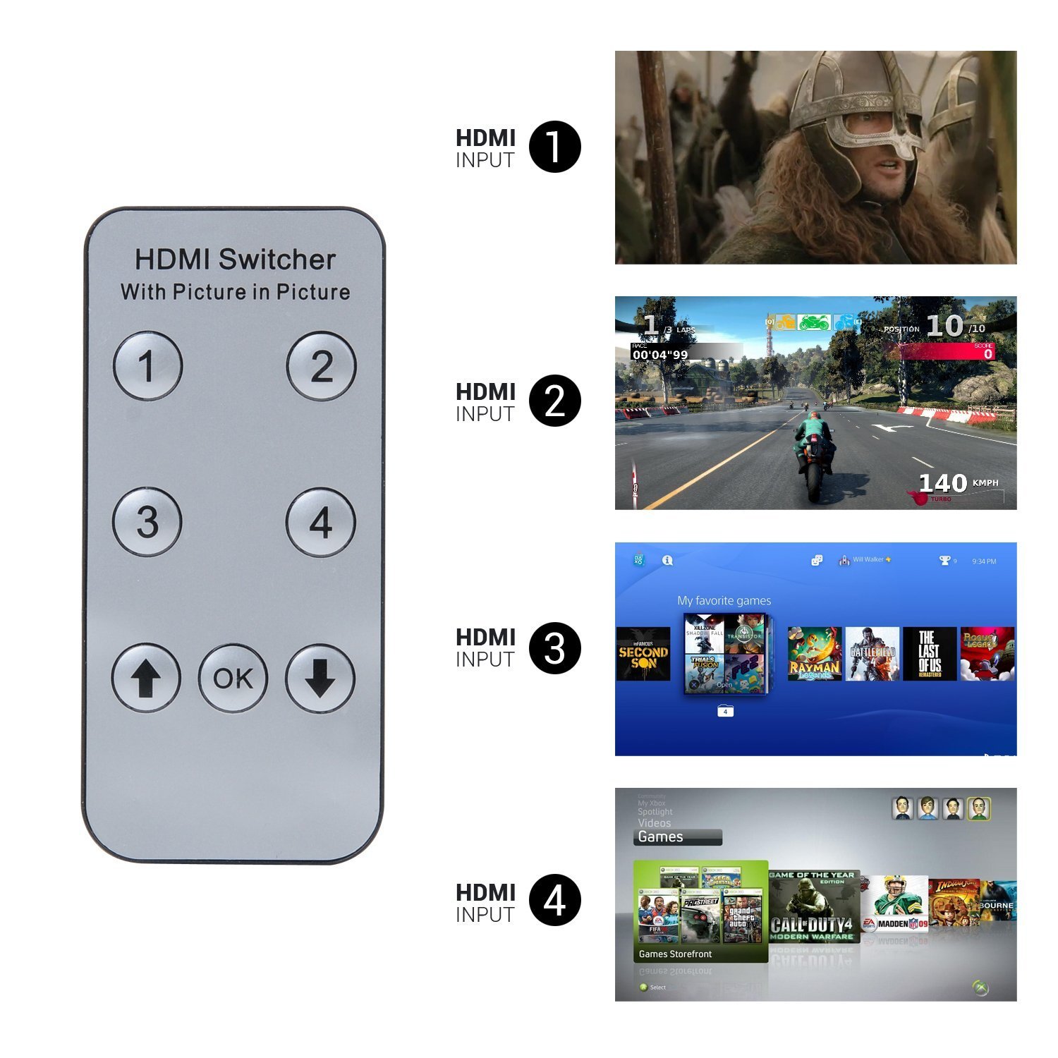 It displays sports live broadcasts, Blueray movies, security camera videos, PS4 game videos, etc. at the same time, and easily switches with remote control.
