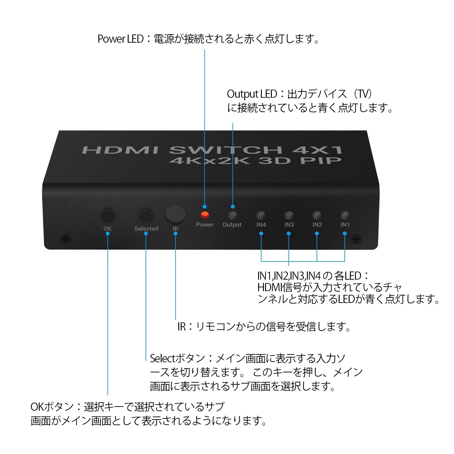 ● HDMI device This is an HDMI switching device that can easily switch and output the video / audio of one device to one HDTV or projector.