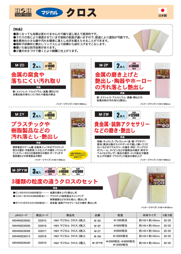 【商品名】 (業務用50セット)H&H マジカルクロス/研磨材 【2枚入/#3000相当】 日本製 M-2P 〔業務用/家庭用〕 【ジャンル・特徴】 繰返し使えて経済的。磨いた後は防汚効果!研磨シート/作業工具 ■サイズ・色違い・関連商品■3種セット 5セット■3種セット 30セット■2枚入/#1000相当 10セット■2枚入/#1000相当 50セット■2枚入/#3000相当 10セット■2枚入/#3000相当 50セット[当ページ]■2枚入/#8000相当 10セット■2枚入/#8000相当 50セット■2枚入/#12000相当 10セット■2枚入/#12000相当 50セット ■商品内容 【ご注意事項】・この商品は下記内容×50セットでお届けします。金属の磨き上げと艶出し・陶器やホーローの汚れ落とし艶出し 特長:黒くなっても効果は変わりませんので繰り返し使えて経済的です。クロスの色により浸透させています砥粒の粒度が違いますので、使途により選別が可能です。各素材の小さな傷や汚れを簡単に落とし光沢を蘇らせることができます。超粒子研磨材と艶出しワックスにより研磨から超仕上げまでこなし