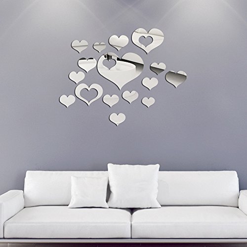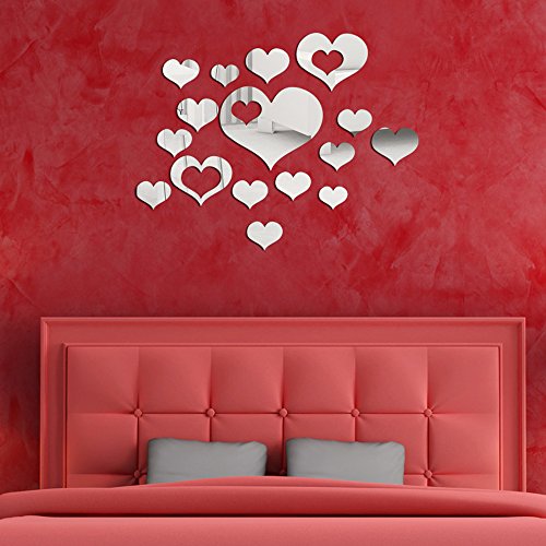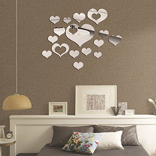16PCS Mirror Wall Stickers Heart Shape Large Size, Removable Acrylic Mirror Wall Decals Wall Art DIY Mirror Wall Decor for Bedroom Living Room TV Background Home Decoration (Silver)