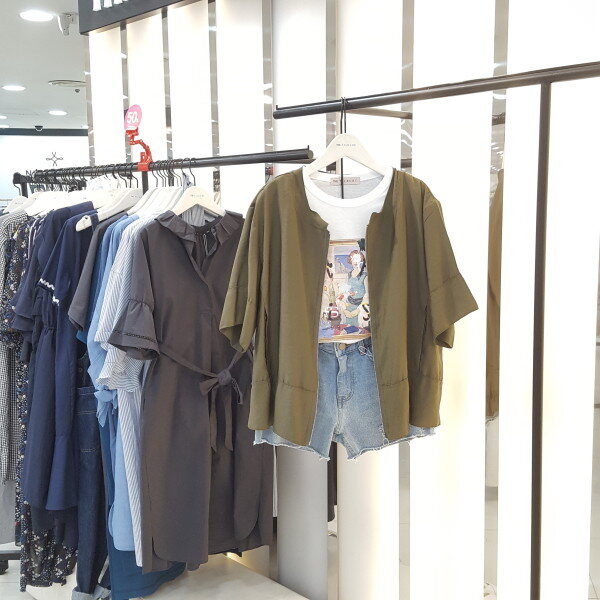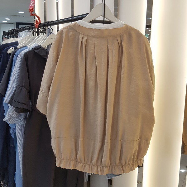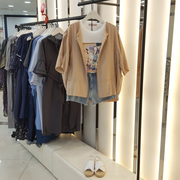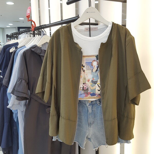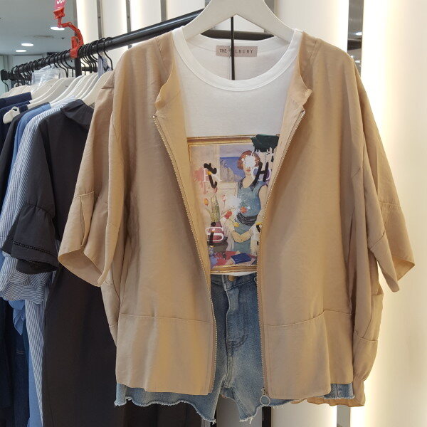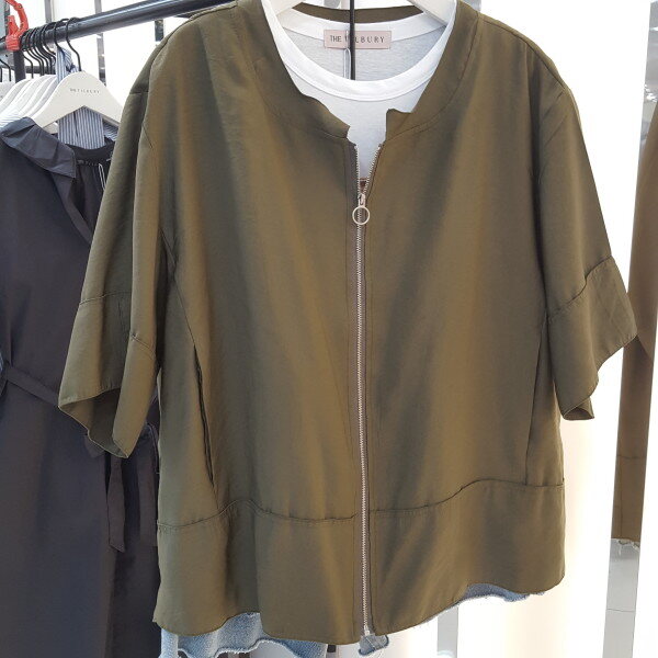 얇고 시원한 여름소재 라운드 점퍼입니다.뒤허리부분 밴드 포인트로 여성스럽게 연출하시기 좋습니다.
