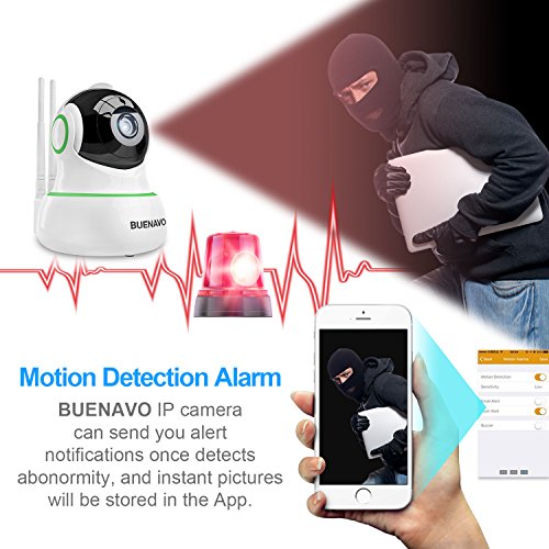 -. Feature : 【PREMIUM 1080P IP CAMERA】355° pan (horizontal) & 90° tilt (vertical) rotation range and 1080P resolution, BUENAVO 1080P Wireless Camera shows you details and every corner of your home via high-definition video. / 【MOTION DETECTION】BuenaVo IP camera use newest motion sensing technology to sent you alert notifications once the camera detects abnormity or alarm is triggered, and instant alarm pictures will be taken and stored in the history in the app. / 【REACH EVERY CORNER】You can use only one finger to reach every corner of your home in 360 eyes APP(apply for iPhone and Android), BuenaVo security monitor use advanced glass lens combined with 355° horizontal & 90° vertical rotation range create a complete 360° coverage. / 【TWO-WAY AUDIO FOR REAL TIME COMMUNICATING】 Advanced compression algorithms yields even better sound quality, supporting a sampling rate of up to 48 KHz; 360° noise-canceling hypersensitive microphone for much clearer voice quality while eliminating excess environmental noise. / 【NO MONTHLY SUBSCRIPTION FEES】 Financial level Encryption Technology, make you connect to any devices, via a secure and safe network. All cameras have CE, FCC and RoHS certified. Full one-year Guarantee Repair provided, please contact us if you need assistance.