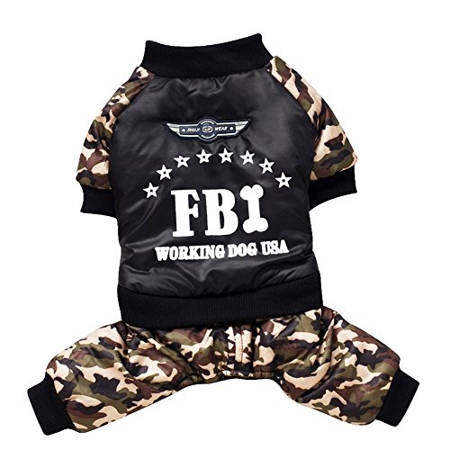 -. Binding : Misc. -. Brand : NACOCO -. Color : camouflage -. Feature : Perfit for everyday wear,holiday,parties,and photos / Made of cotton,let your dog away from cold / Comfy coat is machine-washable for easy care -. Label : xmtang -. Manufacturer : xmtang -. PackageQuantity : 1 -. ProductGroup : Pet Products -. ProductTypeName : PET_SUPPLIES -. Publisher : xmtang -. Studio : xmtang -. Title : Fashion Dog Coat Cotton-padded with FBI Camouflage Coat for Autumn and Winter