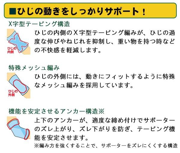 高通気構造採用のテーピング機能付サポーター。着用時の不快なムレを押さえながら、関節を快適にサポートします。伸ばしたときの不安、重い物を持つ時の不快感を軽減。 |
