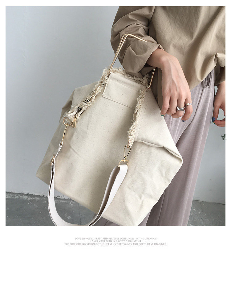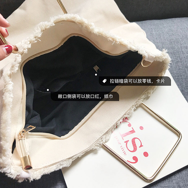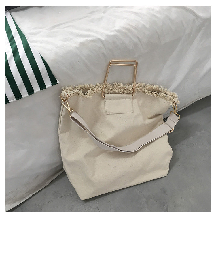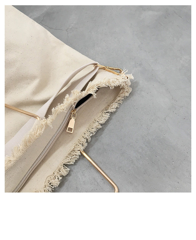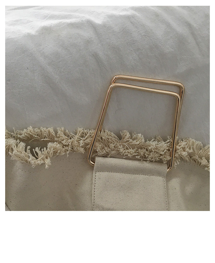 白い麻布の生地の袋には、二つの角の金属の轮がついています。