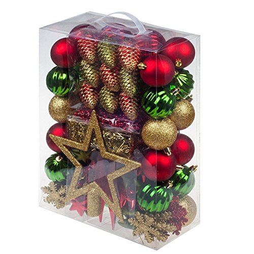 Ornaments hooks and hanging string included for easy hanging. Set of 100pcs Christmas Tree Balls Assortment Kit. All Christmas decorative ornaments are equipped with ornament caps. Material: Plastic, Glitter, and Foil.