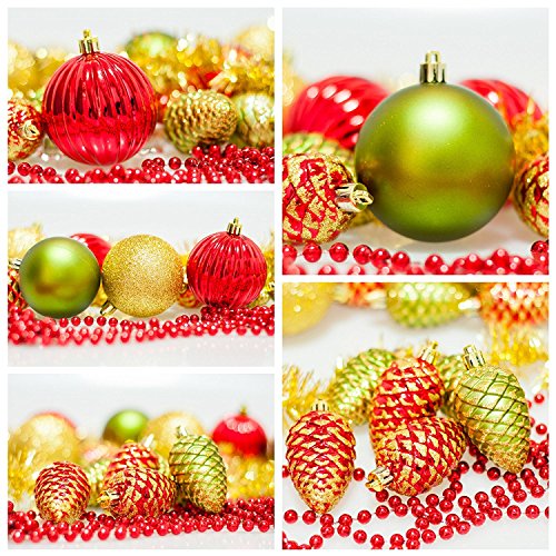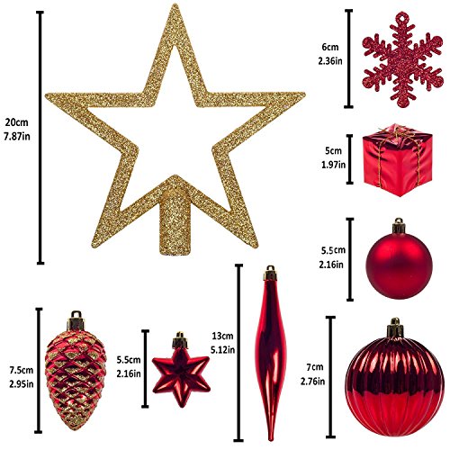 Suits for 4-7 ft trees. This tree decorations set includes diffierent sizes and shapes tree ornaments, making it perfect to add variety and depth to your Christmas tree design.