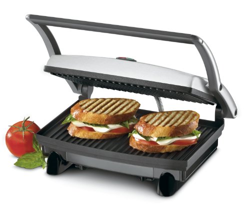Creating restaurant-quality paninis--as well as grilled sandwiches, veggies, pork chops, and more--is simple with this convenient panini press and sandwich maker. The unit's upper and lower 11-by-7-inch nonstick, non-removable grill plates provide even grilling and toasting, plus offer a drip spout that makes it easy to drain grease away from food for healthier cooking. Designed like professional units, its floating hinge adjusts to accommodate any thickness for perfectly grilled thin or thick panini and sandwiches. In addition, the panini press and sandwich maker features "power-on" and "ready-to-cook" indicator lights and a preset temperature to ensure crisp, golden-brown results. An instruction book with recipes and a cleaning tool with the Cuisinart logo are included. In brushed stainless-steel housing embossed with a "Griddler" logo, the panini press and sandwich maker measures 14-1/2 by 6-1/2 by 12 inches and carries a three-year limited warranty.