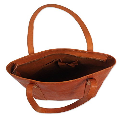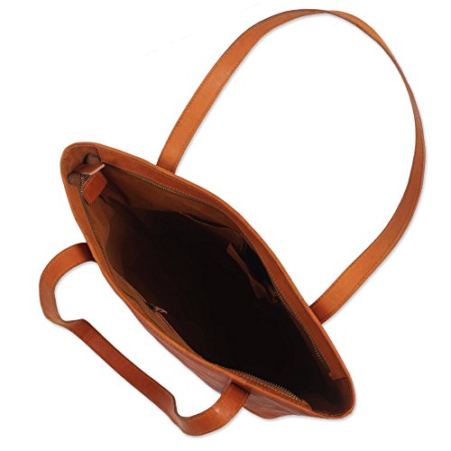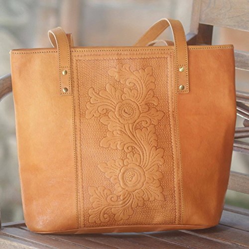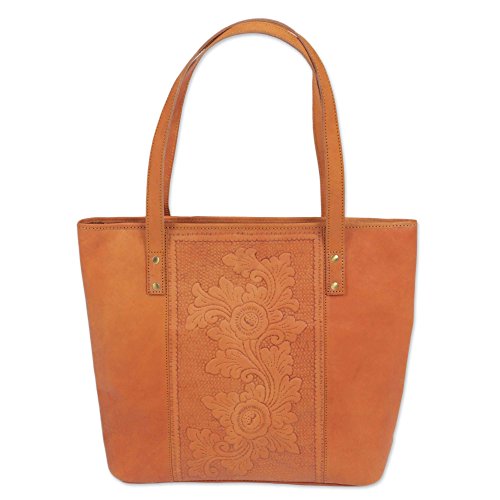 NOVICA Golden Brown Leather Floral Shoulder Bag with Zipper, 'Petaled Temple'