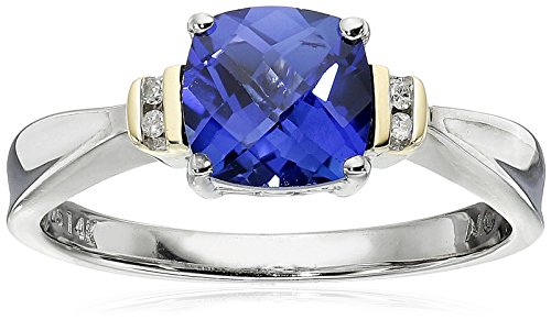 -. Binding : Jewelry -. Brand : Amazon Collection -. Department : womens -. Feature : The natural properties and composition of mined gemstones define the unique beauty of each piece. The image may show slight differences to the actual stone in color and texture / All our diamond suppliers confirm that they comply with the Kimberley Process to ensure that their diamonds are conflict free. / Imported -. Label : Amazon Curated Collection -. Manufacturer : Amazon Curated Collection -. Model : ESZ3755CS-PARENT -. ProductGroup : Jewelry -. ProductTypeName : FINERING -. Publisher : Amazon Curated Collection -. Studio : Amazon Curated Collection -. Title : Sterling Silver and 14k Yellow Gold Checkerboard Cushion-Cut Created Blue Sapphire and Diamond-Accent Ring (0.02 cttw, I-J Color, I3 Clarity)