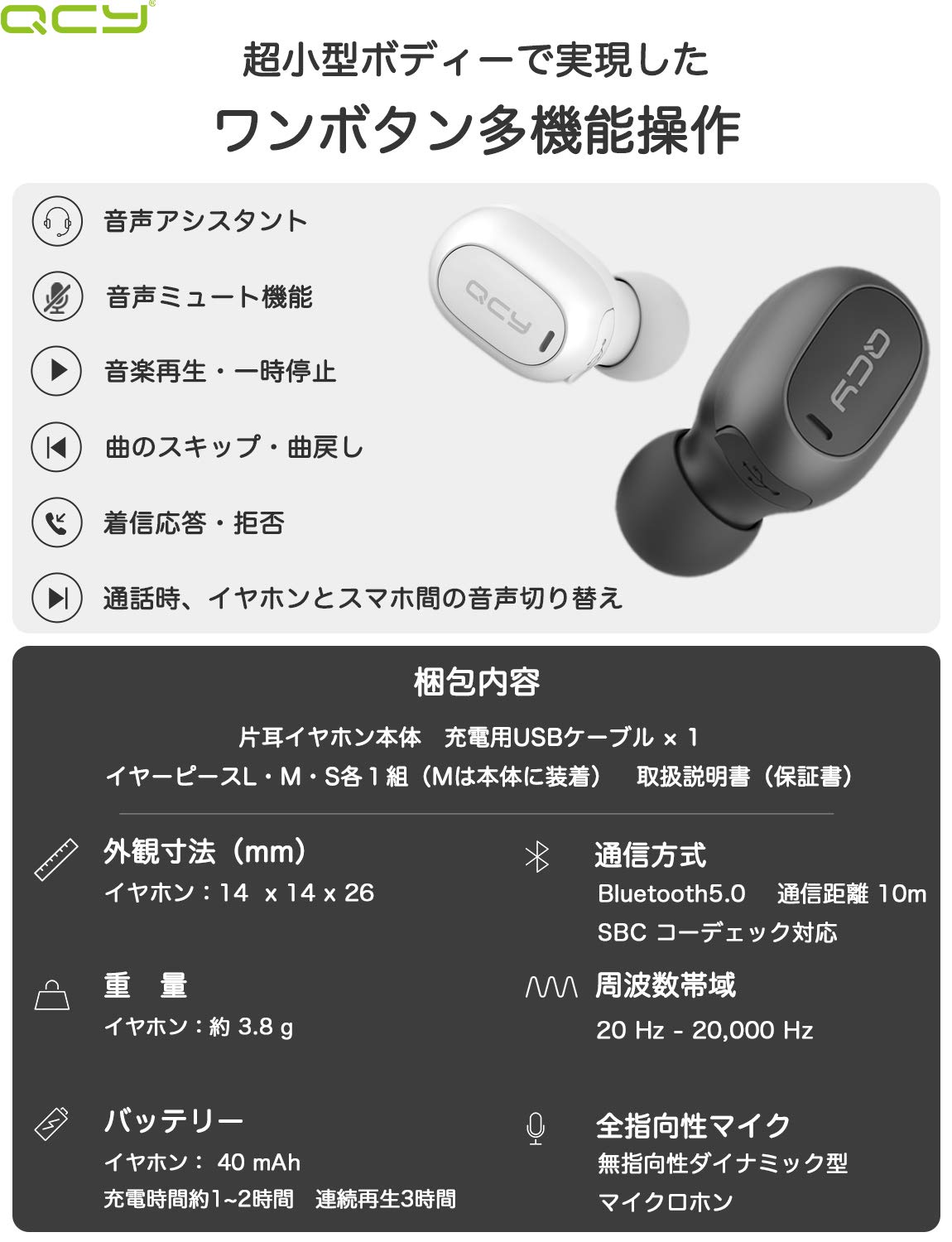 ✅【 Bluetooth5.0 低遅延 進化版 】 最新のBluetooth5.0技術を採用、V4.2以下デバイスとのプロファイル交換性大幅にアップし、ワイヤレス接続の安定性、データの転送スピート、イヤホンの省エネ性能を大幅に向上することで、低遅延のモノラル高音質を実現しました。 簡単・高速・途切れのないペアリング接続が体験できます。初回設定後は、電源をONにするだけで自動的にデバイスに接続されます。(TELEC技適認証番号203-JN0904) ✅【 超軽量 & 超小型 安定した装着感 】 ❶ イヤホンの重さが僅か3.8g、最も薄い部分が僅か12mm、小指先より小さいイヤホン寸法上の新しい次元を開きました。イヤホンらしいシンプルなデザインで耳の中に隠れるほどのコンパクトなボディーを体感してください。❷ アジア人の人間工学的な蝸牛形状のビッグデータを基に、人の外耳部位に密着した斬新な設計を施しています。左右耳のどちらに装着してもしっかりとフィットし楽しめます。❸ 耳への負担を最小限にし、長時間付けても負担を感じせず、移動中も落とす心配がなくご使用になれます。 ✅【 重低音 高音質 & クリアな通話音質 】 イヤホン本体が今までのない小型な構造でありながら、重低音重視のクリアな音質を実現しました。イヤホンに合わせてカスタマイズしたネオジム磁石の7.2mmドライバーと独特の音響構造、クローズドリアキャビティ構造の組み合わせにより、2次ミキシングを効果的に低減し、サウンドをよりクリアに再現します。また、ハート型シリコン全指向性マイクの搭載により、音声認識度を向上しながら環境騒音を低減させ、クリアな通話音質を実現しました。 ✅【 ワンボタン 多機能操作 】 イヤホン本体のMFB(ホームボダン)一つで、電源ON/OFF 、音楽の再生・一時停止、曲のスキップ・音声ミュート、通話切り替えなど、デバイスを取り出すことなく、片手で必要操作を全て実現できます。✅️【幅広い互換性】 AppleのiPhone、アプリ、iPod、サムスンギャラクシーノートシリーズ、Androidデバイス、MP3やMP4音楽プレーヤー、ノートパソコン、タブレットやPCなど、ほとんどのBluetooth対応機器との互換性に対応します。 ✅️【対応機種】 Bluetooth(ブルートゥース)搭載デバイスに対応。Apple iPhoneXs/iPhoneXr/iPhoneX/iPhone8/iPhone8 Plus/iPhone7/iPhone7 Plus/iPhone SE/iPhone6s/iPhone6s Plus/iPhone6等iPhone各機種、iPad/iPod各機種、Sony Xpeira,Google Nexus,Samsung Galaxy,Asus,Fujitsu,Huawei等Android各機種、Windows,Macなどの各種PC。