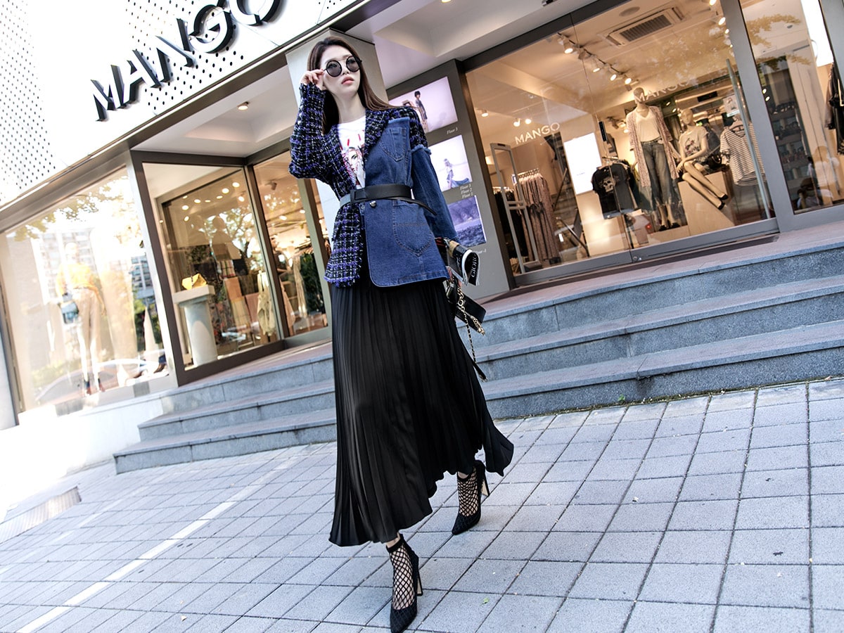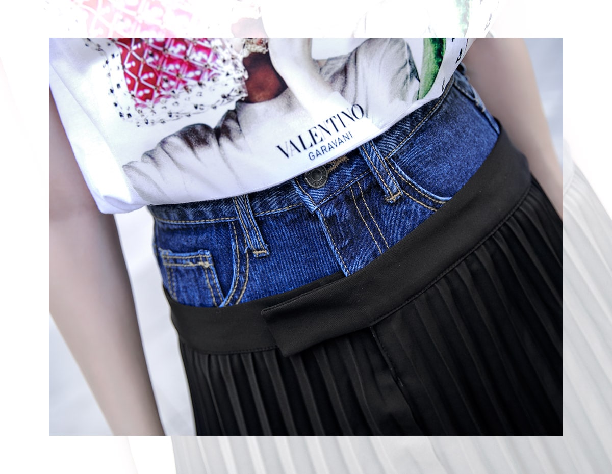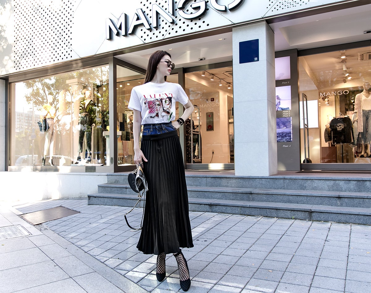 SK1761 데님 레이어드 플리츠 라인 스커트 Black