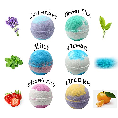 LUXURIOUS GIFT SET OF 6 HUGE BATH BOMBS - this set contains 6 (six) XL bath bombs of 4.2oz each.This gift set contains these 6 amazing scents: Strawberry,Orange,Lavender,Mint,Green Tea,Ocean.