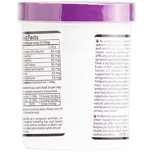 U.T. HEALTH is a health supplement for dogs and cats designed as a natural solution for urinary tract issues. Accidents, pain, and difficulty urinating are just a few symptoms your pet may experience if they have a build up of bacteria, particularly E.coli, in their urinary tract. Commonly, antibiotics are prescribed for these symptoms. However, antibiotics can't distinguish between good or bad bacteria, leaving your pet's immune system weakened and increasing the chances of recurring infections. U.T. Health is a natural healing alternative. U.T. HEALTH's holistic formula is based off of Vibrant Health's U.T. Vibrance and has been adapted for use in dogs and cats. Bacteria, particularly E. Coli is attracted to D-Mannose and will dislodge from the urinary tract wall, attach to the D-Mannose, and be excreted from the body. In this way, D-Mannose helps to eradicate bacteria from the urinary tract. Antioxidant-rich plants such as parsley, goldenrod, and dandelion support and restore urinary tract health by promoting urination and cleansing internally.Feature