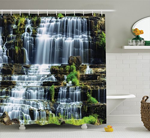 Rainforest Decorations Shower Curtain Set By Ambesonne, Waterfall In The Middle Of Tropical Jungle Natural Scenery Countryside Style, Bathroom Accessories, 69W X 70L Inches, Green White