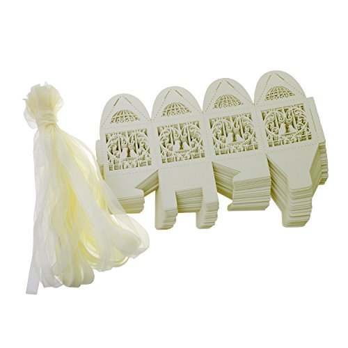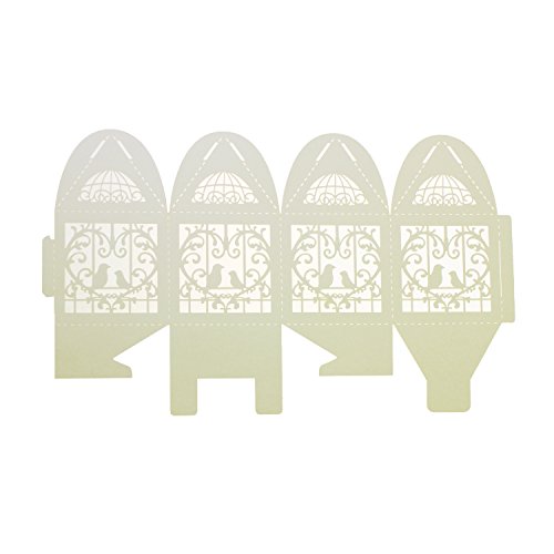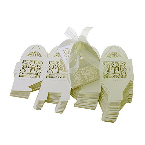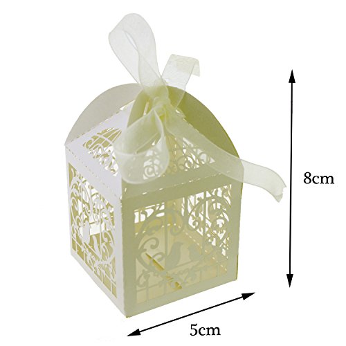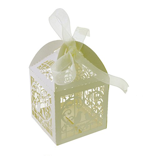 UNIQLED Pack of 60 Laser Cut Pair Love Birds Wedding Party Favor Box Candy Boxes Chocolate Gift Bag Bridal Baby Shower Cubic with Ribbons (Cream)